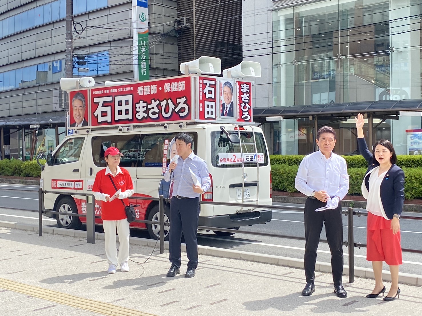 昨日は、全国比例「石田まさひろ」候補の街宣車で、